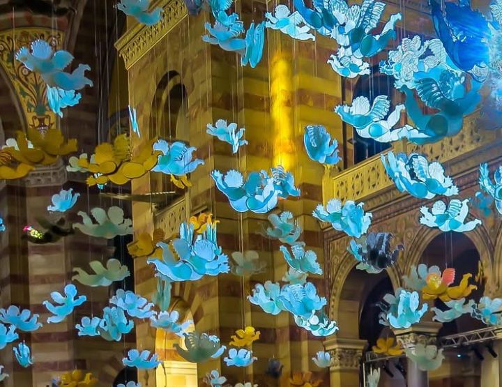 Les expositions dans les églises sont si rares qu’il faut en profiter ! Marc Coville, alias Marcoville, est un sculpteur français originaire de Boulogne-Billancourt connu et exposé partout dans le monde depuis les années 70 pour son travail de valorisation de matériaux destinés au rebut. Verres, métaux, cartons… depuis des décennies il récupère les déchets de notre quotidien dans une démarche artistique mais aussi écologique, et les transforme en objets d’art uniques. Il explore notamment le verre de seconde main qu’il cisèle, colore et emplie pour créer des œuvres lumineuses et particulièrement vibrantes. « Le verre qui est là, c’est de la récupération, explique-t-il, je pourrais l’acheter, cela irait plus vite mais j’aime aller chercher les choses qui sont fichues, comme des vitres cassées, et les remettre dans le circuit car cela redonne à ces bouts de verre une nouvelle vie, et même une vie meilleure que celle qu’ils ont eue ». Ses compositions, aux inspirations multiples mêlent ainsi nature, spiritualité et imaginaire. Cette fois, dans la cathédrale de la Major à Marseille et jusqu’au 10 mars 2026, l’artiste nous offre une forêt d’arbres exotiques de près de 5 mètres de hauteur, une nuée de 600 anges en verre transparent sablé et or le long de la nef, 50 madones grandeur nature et devant l’autel, 30 000 poissons en verre irisé qui s’élèvent vers le ciel jusqu’à 30 mètres de haut, comme un banc de poissons célestes… Plus qu’une exposition, des œuvres monumentales à voir comme un véritable spectacle qui s’inscrit parfaitement dans la féérie des fêtes de Noël 🕊️🌎✨